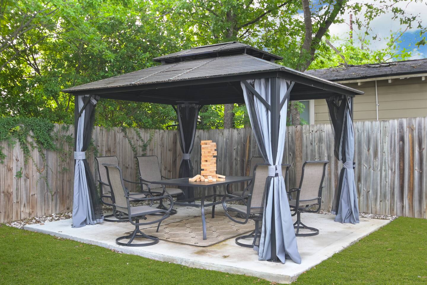 The Marbled Speakeasy is a gorgeous 4-bedroom, 2-bathroom home with decor that takes you back to the Roaring 1920s. Beautiful inside, plus a luxurious outdoor space with a gazebo, dining table, and artificial turf perfect for backyard games. Located in the historic and charming neighborhood of Dignowity Hill, less than a mile from the Riverwalk and Alamodome, and less than two miles from the Pearl District and Brackenridge Park. Take advantage of discounts for longer stays. STR-24-13500087
